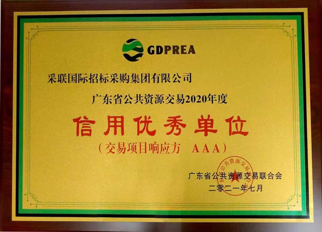采联国际招标采购集团有限公司(以下简称采联集团)凭借十五年来对“正念善行”理念的践行、对“正义公平”形象的坚守、以及持之以恒推动行业诚信体系的建树,成功入选2020年度广东省公共资源交易行业信用优秀单位,荣获“2020年度广东省公共资源交易行业信用优秀单位(交易项目响应方)、2020年度广东省公共资源交易行业信用优秀单位(中介服务机构)”荣誉称号。