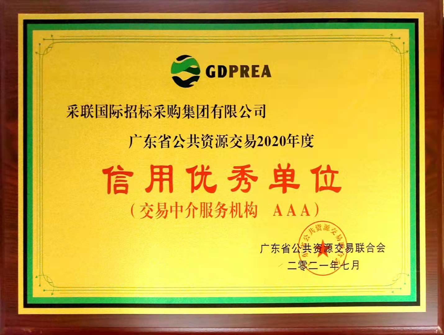 又日新 ▎热烈祝贺采联集团荣获“2020年度广东省公共资源交易行业信用优秀单位”荣誉称号